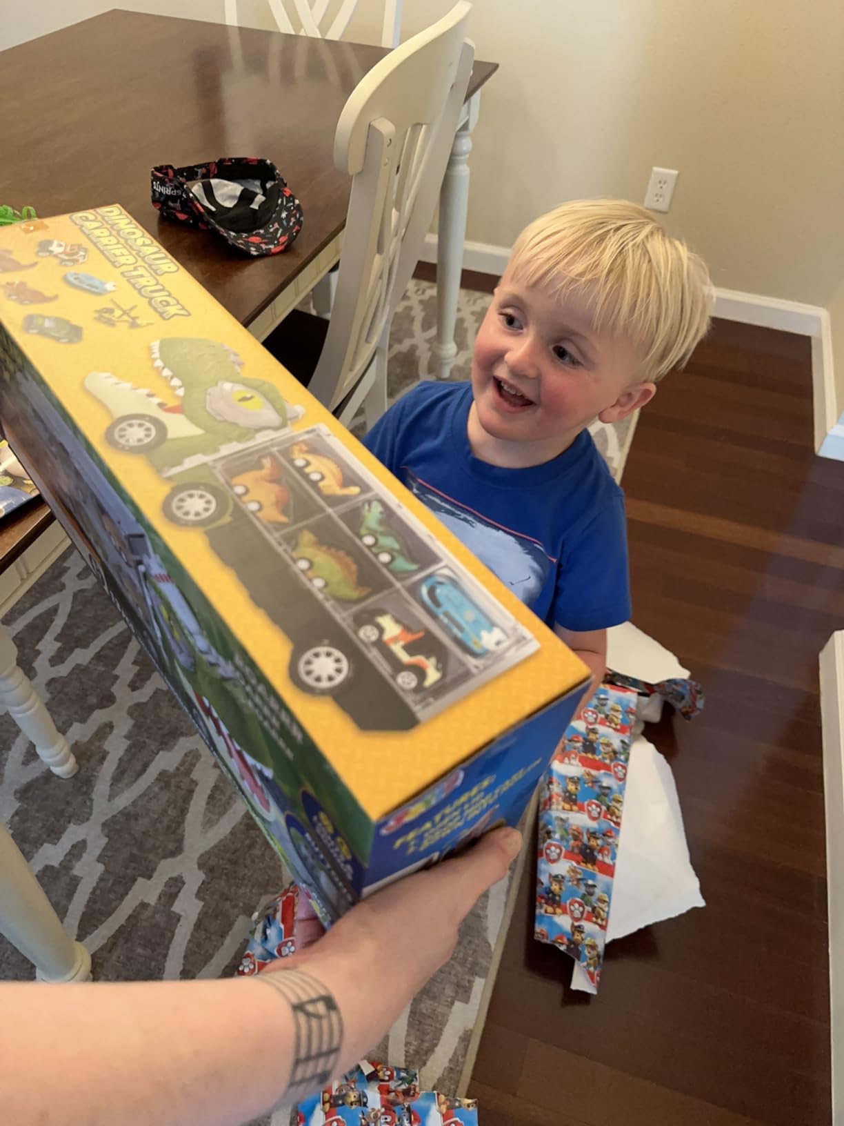 The set is designed for ages 3–6, though many parents say even 2-year-olds enjoy it with supervision. It’s perfect for preschoolers who love trucks, dinosaurs, and light-up toys — but there’s really no age limit when it comes to imaginative play. Older kids and even parents often end up joining in the fun too!