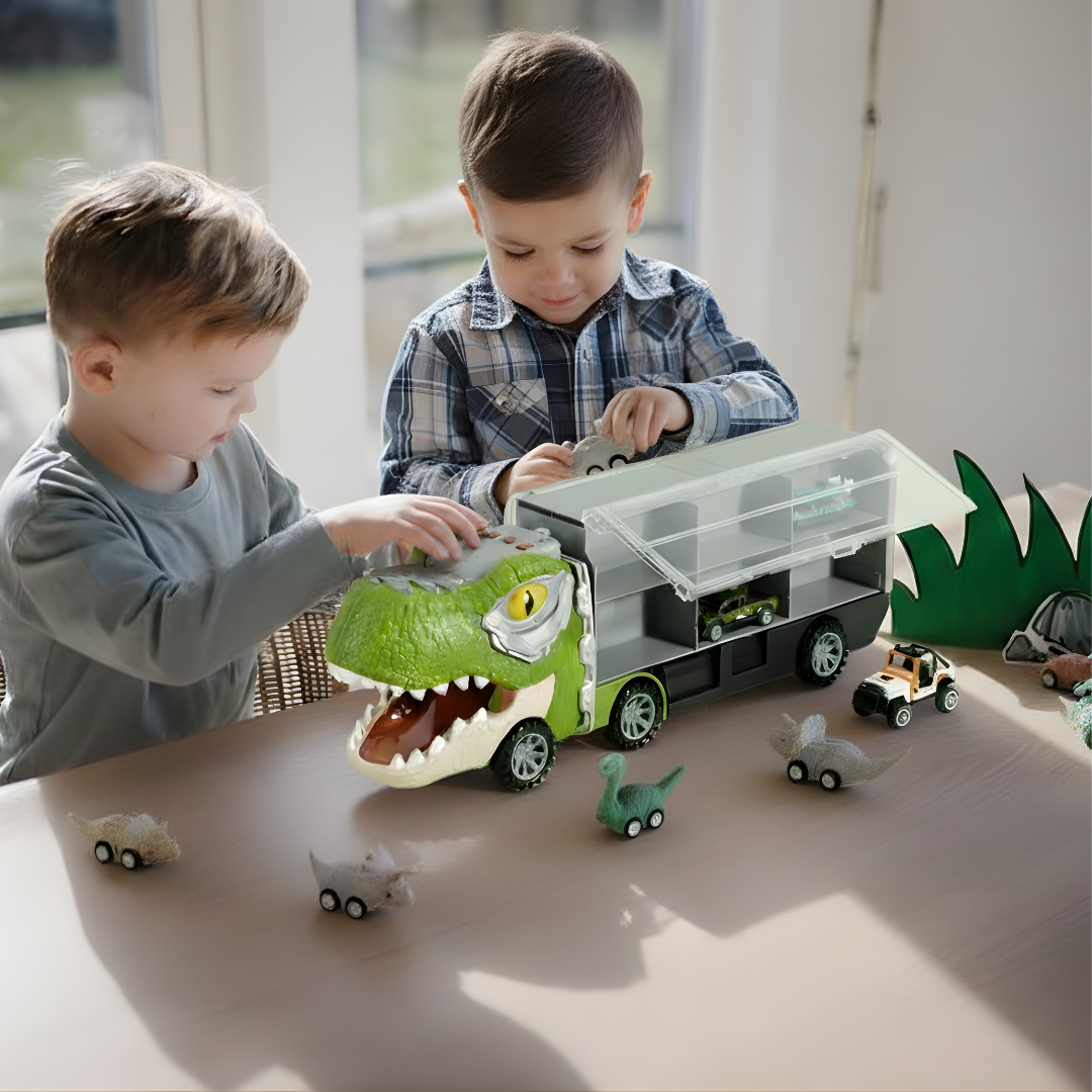 DinoJoy isn’t just another dinosaur truck — it’s a full adventure in one box. With roaring sounds, flashing lights, and pull-back dino cars stored inside the T-Rex carrier, it keeps kids entertained for hours. Built safe, sturdy, and long-lasting,
